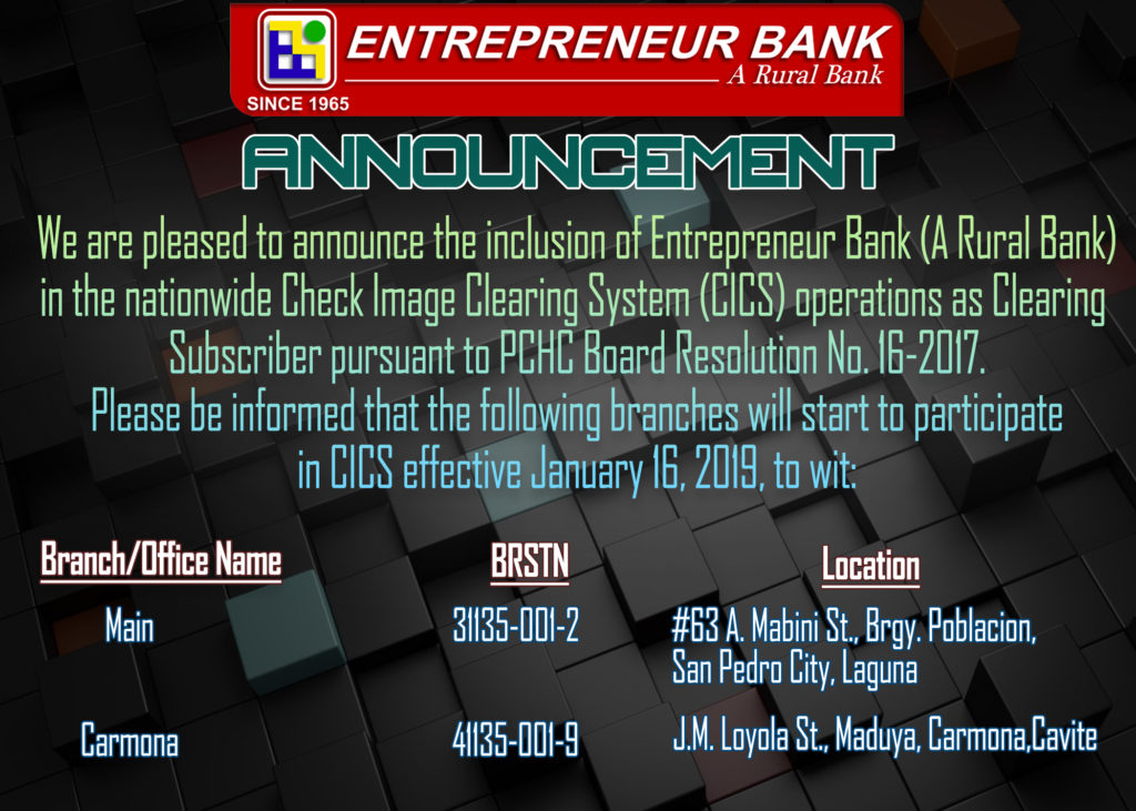 We are pleased to announce the inclusion of Entrepreneur Bank (A Rural Bank) in the nationwide Check Image Clearing System (CICS) operations as Clearing Subscriber pursuant to PCHC Board Resolution No. 16-2017. Please be informed that the following branches will start to participate in CICS effective January 16, 2019, to wit: